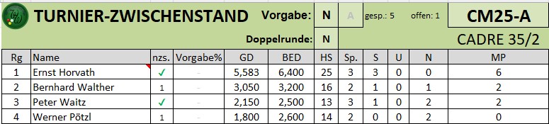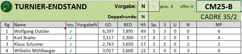 - BWW-Dreiband (MB) belegt in 2. Bundesliga C Rang 5 unter 6 Mannschaften (Sieger: POT2)
