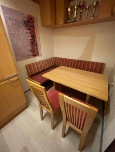 Seit kurzem steht in der Küche eine neuwertige, gemütliche Sitzgruppe mit Tisch, Eckbank und zwei Stühlen, die wir sehr günstig erstanden haben.