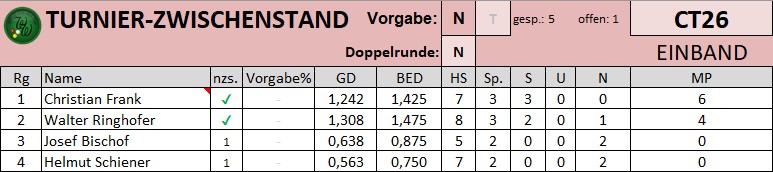 Hier der Zwischenstand im Clubturnier Einband vom 03.02.2026 – vor dem letzten Spiel, bei dem es um Rang 3 geht: