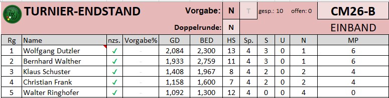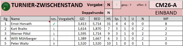 Hier der Zwischenstand in der Einband-Clubmeisterschaft vom 17.3.2026: