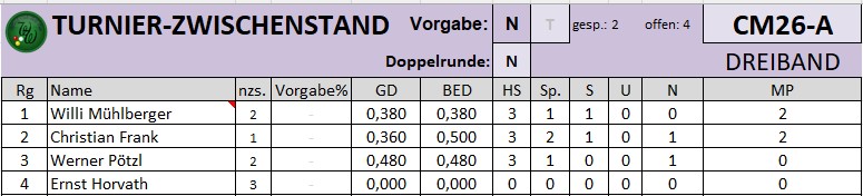 Am kommenden Wochenende 25.4.+26.4.2026 ist unser Club Austragungsort für das Verbandsturnier Cadre 47/2 Nationalklasse am Matchbillard.