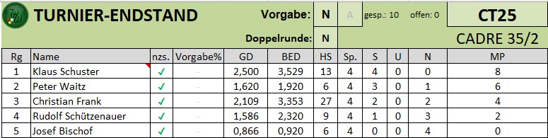 Klaus Schuster gewinnt mit dem Clubturnier Cadre sein erstes BWW-internes Turnier. Gratulation! Bisher hatte Klaus „nur“ auf Verbandsebene einen Turnier-Sieg errungen.