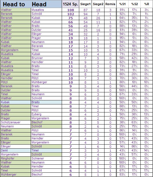 Head to Head Frei Die ewige "Head to Head"-Liste in der Freien Partie (seit 2013, mindestens 6 Matches), Stand 31.12.2025: