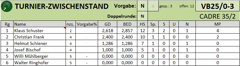Zwischenstand Vorrunde Cadre 4. Klasse (KB) 2 November 2025, 7:00 Bis 9.11. läuft die Vorrunde für Cadre 4. Klasse (KB). 6 Spieler haben genannt. Der Zwischenstand vom 1.11.2025: Im Vorjahr hat Klaus Schuster nicht nur die Vorrunde, sondern auch das Finalturnier gewonnen. Er ist somit Titelverteidiger.